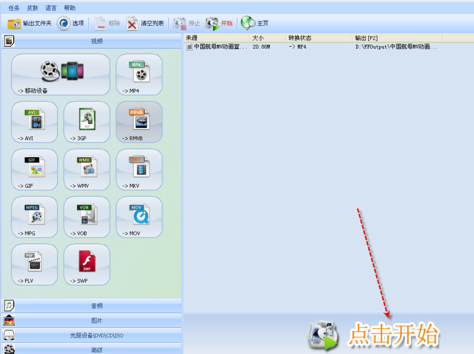 步驟3、設(shè)置音頻文件的輸出格式,在彈出的”轉(zhuǎn)換“窗口,在”設(shè)置“欄里,將”配置文件“改成”Audio – MP3“,最后點(diǎn)擊”開始“按鈕,進(jìn)行音頻轉(zhuǎn)換mp3即可。
